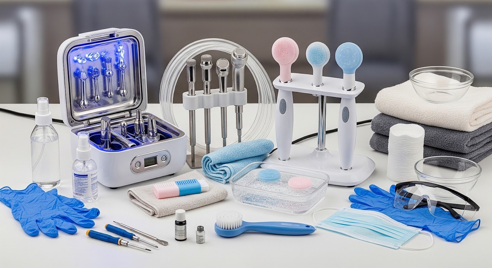 Регулярна дезінфекція та стерилізація — важливе правило догляду за апаратами. Після кожного клієнта всі насадки, наконечники та шланги, що безпосередньо контактували зі шкірою, повинні проходити ретельне очищення. Залежно від типу насадок, це може включати промивання під проточною водою із використанням спеціальних мийних засобів, а також подальшу дезінфекцію професійними антисептиками, рекомендованими виробником. Для багаторазових насадок, зокрема металевих або скляних, може знадобитися стерилізація в автоклаві або сухожаровому шафі.