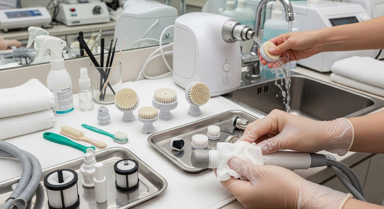 Підтримання апаратів для мікродермабразії та брашингу в бездоганному стані — запорука не лише їх довговічності, а й безпеки проведених процедур. Апарати для мікродермабразії працюють з механічним впливом на шкіру і потребують особливої уваги до чистоти та справності всіх компонентів.
