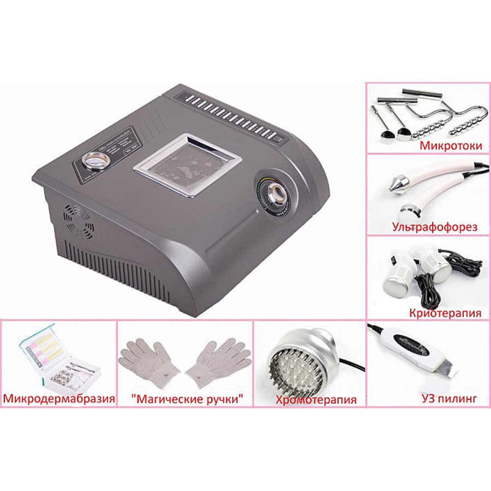 властивості: Вакуумна потужність & nbsp; 0,792 атм Предназначение для обличчя і тіла кількість маніпул для дермобразії & nbsp; 9 одиниць Частота випромінювання УЗ-скрабера/Інтенсивність УЗ 28 кГЦ/до 1 Вт/см2 Маніпули кріотерапії (тепло, холод) 42°/1-2° Кількість режимів мікрострумової терапії 4 Маніпули біполярні, монополярні електроди, 3 пари змінних додатково Додатково комплекте рукавички Насадки для ультразвукового фонофорезу 2 одиниці Частотність УЗ-фонофорезу 1,1 мГЦ хромотерапія 7 кольорів Габариты 50×49×30 см Вага & nbsp; & nbsp; 11,5 кг< / p>