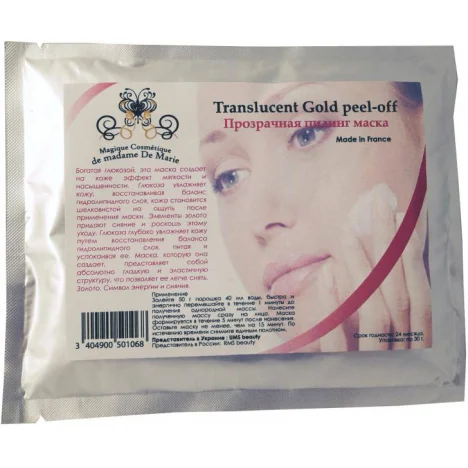 багата глюкозою, ця маска створює на шкірі ефект м'якості і насиченості. Глюкоза зволожує шкіру, відновлюючи баланс гідроліпідного шару, шкіра стає шовковистою на дотик після застосування маски. Елементи золота надають сяйво і розкіш цьому догляду. Глюкоза клубоко зволожує шкіру шляхом відновлення балансу гідроліпідного шару, живлячи і заспокоюючи її. Маска, яку вона створює, являє собою абсолютно гладку і еластичну структуру, що дозволяє її легше зняти. Золото. Символ енергії і сяйва.застосування < br />залийте 50г порошку 40мл води, швидко і енергійно перемішайте протягом 1 хвилини до отримання однорідної маси. Нанесіть отриману масу відразу на обличчя. Маска формується протягом 5 хвилин після нанесення. Залиште маску не менше ніж на 15 хвилин. По закінченню часу зніміть єдиним полотном.< / P>